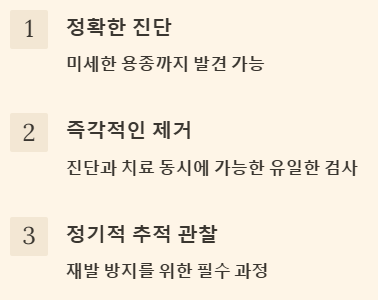 - 정확한 진단: 대장 내부의 미세한 용종까지 찾아낼 수 있으며, 용종의 크기와 모양, 위치 등을 정확하게 파악하여 암으로 발전할 가능성을 평가할 수 있습니다.