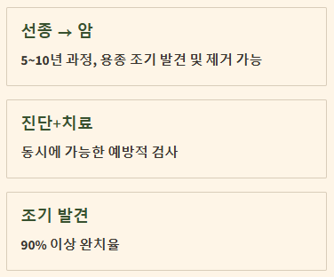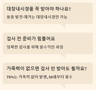 👉 분변잠혈검사(대변 검사)도 대장암을 선별하는 좋은 방법이지만, 용종을 발견하고 제거할 수 있는 것은 대장내시경이 유일합니다. 따라서 대장암을 근본적으로 예방하기 위해서는 대장내시경이 필수적입니다.