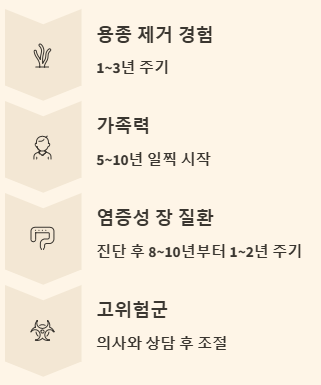 - 용종 제거 경험이 있는 경우: 검사에서 용종을 제거한 경험이 있다면, 새로운 용종이 생길 가능성이 높습니다. 용종의 크기, 개수, 조직 검사 결과에 따라 의사의 판단에 따라 1~3년 주기로 검사를 받는 것이 좋습니다.