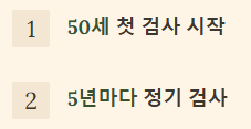 - 5년마다 정기 검사: 첫 검사에서 이상 소견이 발견되지 않았다면, 이후 5년마다 정기적으로 검사를 받는 것이 일반적인 주기입니다.