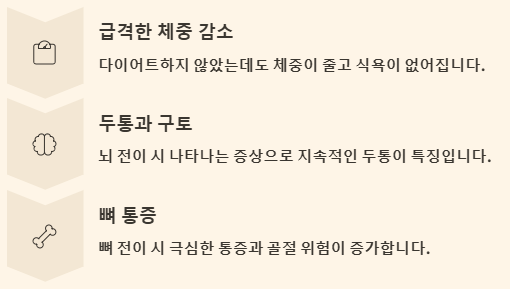 - 체중 감소와 식욕 부진: 특별히 다이어트를 하지 않았는데도 체중이 급격히 줄거나 식욕이 없다면 암으로 인한 전신 증상일 수 있습니다.