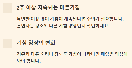 - 2주 이상 지속되는 마른기침: 특별한 이유 없이 기침이 2주 이상 계속된다면 폐암의 신호일 수 있습니다. 특히 흡연자의 경우 '흡연자 기침'으로 여겨 방치하기 쉽지만, 평소와 다른 기침 양상이라면 검진이 필요합니다.