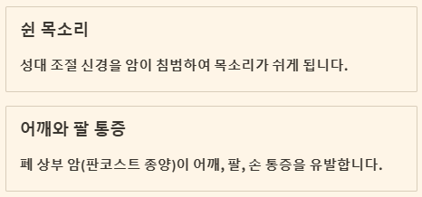 - 쉰 목소리: 성대를 조절하는 신경은 폐와 기관 사이를 지나갑니다. 폐암이 이 신경을 침범하면 성대가 마비되어 목소리가 쉬게 됩니다. 특별한 이유 없이 목이 계속 쉬어 있다면 주의 깊게 살펴봐야 합니다.