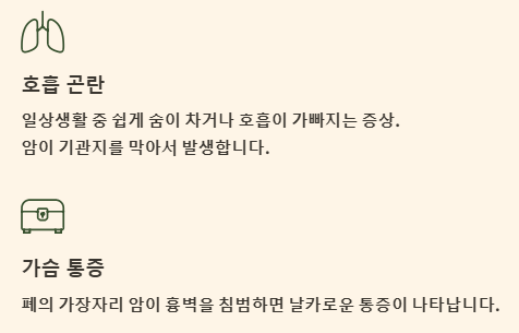 - 숨이 차고 호흡이 가쁜 증상: 힘든 운동을 하지 않았는데도 쉽게 숨이 차거나, 일상생활 중 호흡 곤란을 느낀다면 폐암의 가능성이 있습니다. 암이 기관지를 막거나 흉막에 물이 차면서 호흡을 방해하기 때문에 나타나는 증상입니다.