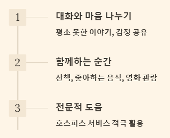- 대화하고 마음 나누기: 환자의 감정에 귀 기울이고, 평소 하지 못했던 이야기를 나누며 서로의 마음을 확인하는 시간이 필요합니다.