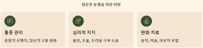 - 다양한 완화 치료 프로그램: 음악, 미술, 아로마 요법 등 다양한 프로그램을 통해 환자의 정서적 안정을 돕고, 삶의 활력을 되찾을 수 있도록 지원합니다.
