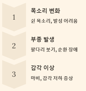 - 신경 압박 증상: 암 덩어리가 신경을 압박하면 목소리가 쉬거나(쉰 목소리), 팔다리가 붓는(부종) 등의 증상이 나타납니다. 때로는 팔다리 마비나 감각 이상을 초래하기도 합니다.