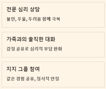 폐암 4기 진단은 환자 본인뿐만 아니라 가족에게도 큰 심리적 부담을 줍니다. 불안, 우울, 두려움을 혼자 감당하려 하지 마세요. 전문 심리 상담, 가족과의 솔직한 대화, 그리고 지지 그룹을 통해 마음의 평화를 찾는 것이 치료의 중요한 부분입니다. 긍정적인 마음가짐은 치료 효과를 높이는 가장 강력한 무기입니다.