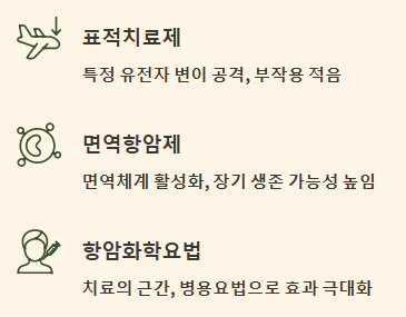 - 표적치료제: 암세포가 가진 특정 유전자 변이(예: EGFR, ALK, ROS1 등)를 찾아 선택적으로 공격하는 치료제입니다. 정상 세포에 대한 손상이 적어 기존 항암제보다 부작용이 훨씬 적고, 반응률이 높아 환자의 삶의 질을 획기적으로 개선합니다. 치료 전 유전자 검사를 통해 표적치료제 사용 가능 여부를 확인하는 것이 중요합니다.