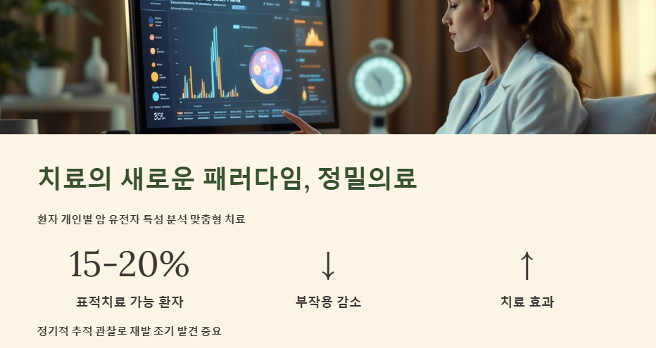 최근에는 환자 개개인의 암 유전자 특성을 분석해 맞춤형 치료를 제공하는 '정밀의료'가 주목받고 있습니다. 폐암 환자의 약 15~20%는 표적치료가 가능한 유전자 변이를 가지고 있으며, 이러한 변이가 발견되면 해당 유전자를 표적으로 하는 약물 치료를 통해 부작용을 줄이고 치료 효과를 높일 수 있습니다.