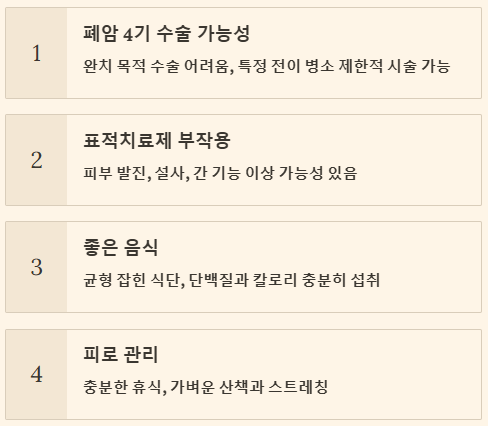 또한, 폐암 4기는 치료 후 재발 위험이 여전히 높기 때문에, 정기적인 추적 관찰을 통해 조기에 재발을 발견하고 대처하는 것이 매우 중요합니다. 이는 환자가 암을 만성질환처럼 관리하며 장기 생존하는 '롱테일(long-tail)' 효과를 가져올 수 있습니다.