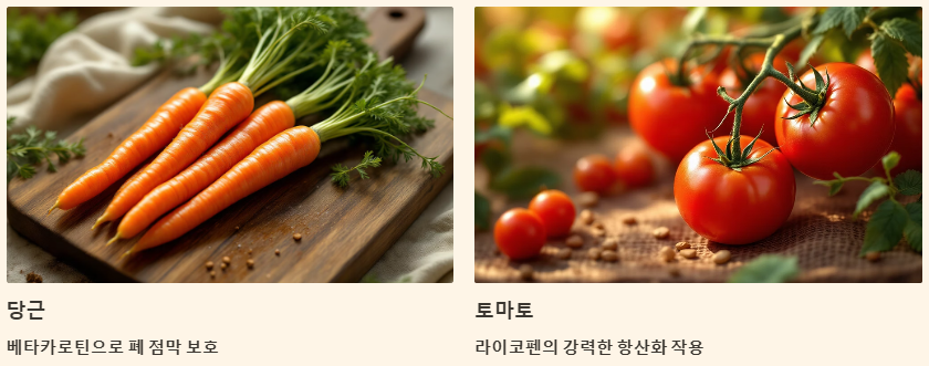 - 당근: 베타카로틴이 풍부하여 폐 점막을 보호하고 면역력을 강화합니다.