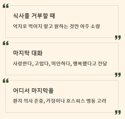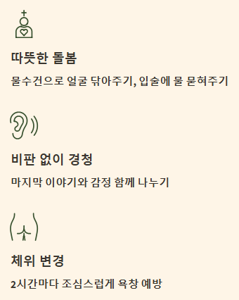 👉 환자가 의식이 없더라도 청각은 마지막까지 남아있다고 알려져 있습니다. 따라서 환자에게 사랑한다고, 고맙다고, 미안하다고, 행복했다고 진심을 담아 이야기해주세요. 과거의 좋은 추억들을 함께 이야기하는 것도 좋습니다. 환자에게 사랑을 전하는 마지막 교감의 시간을 만드세요.