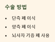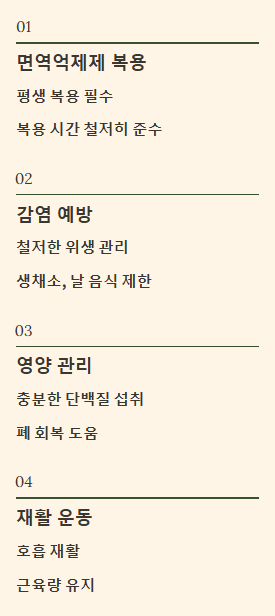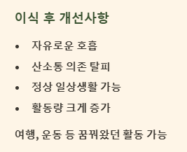 또한 감염 예방을 위해 철저한 위생 관리와 함께 생채소, 생과일, 날 음식 등은 제한하고, 충분한 단백질 섭취를 통해 폐의 회복을 도와야 합니다. 꾸준한 호흡 재활과 운동을 통해 근육량을 유지하고 새로운 폐의 기능을 최대한 끌어올리는 노력도 필요합니다.