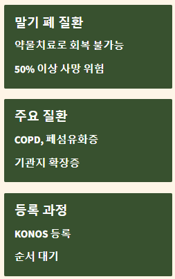 하지만 폐암 환자는 이식 후 재발 가능성이 높아 일반적으로 대상에서 제외됩니다. 이식 대상자는 혈액형, 조직 항원 등 다양한 검사를 거쳐 보건복지부 산하 국립장기조직혈액관리원(KONOS)에 등록하여 순서를 기다리게 됩니다.