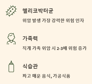 - 가족력: 직계 가족 중 위암 환자가 있는 경우, 위암 발생 위험이 2~3배 이상 높아집니다.