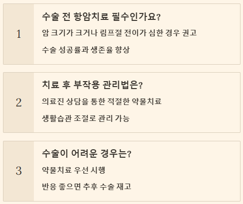 - 선행 항암화학요법: 수술 전 항암제를 투여하여 암의 크기를 줄이고 주변 림프절 전이를 억제하여 수술 성공률을 높이고 재발 위험을 낮추는 목적으로 시행됩니다.