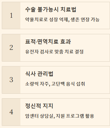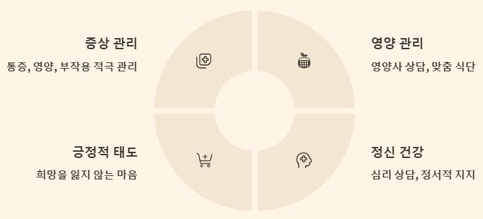 - 증상 관리: 암 자체의 증상과 치료 부작용을 적극적으로 관리하여 환자의 고통을 줄이고 삶의 질을 유지하는 것이 매우 중요합니다. 통증 관리, 영양 공급, 오심/구토 조절 등을 의료진과 긴밀히 상의해야 합니다.