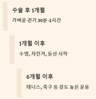 - 1개월 이후: 몸 상태에 맞춰 수영, 자전거, 등산과 같은 가벼운 운동을 시작할 수 있습니다.