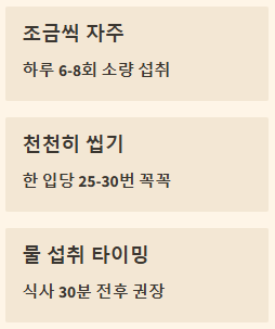 - 천천히, 오래 씹기: 소화 기능이 떨어져 있으므로 한 입당 25~30번 이상 꼭꼭 씹어 먹는 습관을 들이세요.
