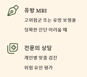 고위험군이거나 유방 보형물이 있는 경우, 또는 다른 검사만으로 정확한 진단이 어려울 때 유방 MRI와 같은 정밀 검사를 추가로 시행할 수 있습니다.