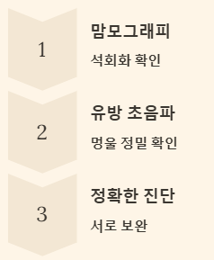 이 경우, 맘모그래피로 유방의 석회화 여부를 확인하고, 유방 초음파로 멍울의 유무를 정밀하게 확인하는 두 가지 검사를 병행하는 것이 가장 정확하고 효과적인 방법입니다.
