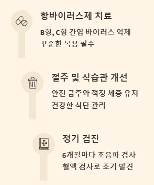 간경화 환자 또는 만성 간염 환자는 증상이 없더라도 최소 6개월에 한 번씩 초음파와 혈액 검사(알파태아단백 검사)를 통해 간암 발생 여부를 확인해야 합니다.