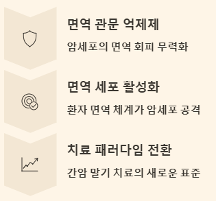 최근 몇 년간 가장 큰 치료 성과를 보인 것은 바로 면역 항암 요법입니다. 이는 간암 말기 치료의 패러다임을 바꾸고 있습니다.
