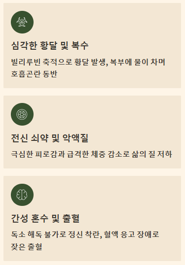 간 기능이 크게 저하되면서 노란색 색소인 빌리루빈이 체내에 쌓여 심각한 황달이 나타납니다. 또한 수분 조절 능력이 상실되어 복부에 물이 차는 복수가 심해지고, 이로 인한 호흡 곤란 및 통증이 동반됩니다.