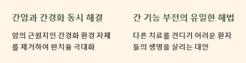간이식은 다른 암 치료와 달리, 간암의 재발 가능성을 높이는 주요 원인인 간경화를 근본적으로 해결해 준다는 점에서 특별한 의미를 가집니다.