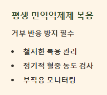 면역억제제 복용으로 면역력이 떨어지기 쉬우므로, 손 씻기, 마스크 착용 등 감염 예방 수칙을 철저히 지켜야 합니다. 익히지 않은 날 음식이나 지하수는 피하고, 백신 접종을 통해 미리 감염을 예방하는 것도 중요합니다.