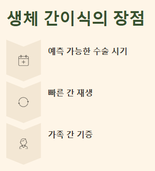👉 생체 간 기증은 기증자의 안전을 최우선으로 고려하며, 매우 엄격한 사전 검사를 거칩니다. 간은 재생 능력이 뛰어나 기증 후 남은 간은 보통 3~6개월 내에 원래 크기만큼 회복됩니다.