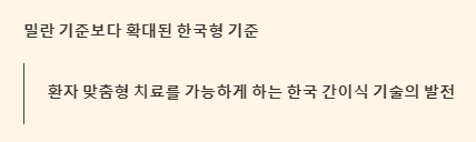 국내 의료진들이 간이식 대상을 확대하기 위해 고안한 기준 중 하나로, 밀란 기준보다 암의 크기나 개수가 다소 크더라도 우수한 성적을 보고하고 있습니다. 이는 환자 맞춤형 치료를 가능하게 하는 한국 간이식 기술의 발전을 보여줍니다. 특히 우리나라 의료진이 개발한 변형우엽 간이식 수술법은 전 세계적으로 생체 간이식의 표준 수술법이 되기도 했습니다.
