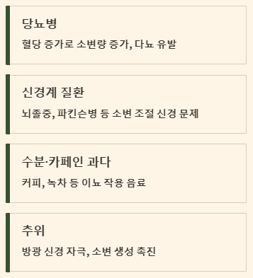 과민성 방광 | 가장 흔한 원인. 방광 근육이 예민해져 소변이 조금만 차도 강한 요의(절박뇨)와 함께 빈뇨 유발. |