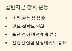 골반 밑 근육(괄약근)을 강화하는 운동으로, 소변을 참는 힘을 길러주어 빈뇨 및 절박뇨 증상 완화에 큰 도움이 됩니다. 특히 출산 경험이 있는 여성이나 전립선 질환을 앓는 남성 모두에게 중요합니다.