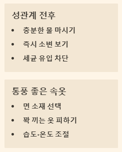 - 충분한 수분 섭취: 하루 1.5~2L 이상의 물을 마셔 소변량을 늘리고 세균 배출을 촉진합니다.