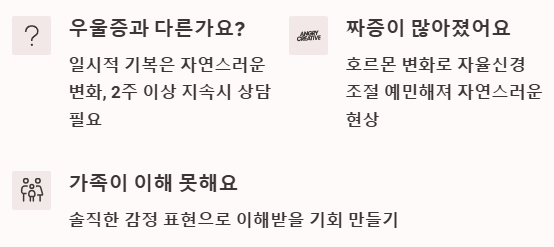 👉 네, 일시적인 감정 기복은 대부분 자연스러운 변화예요. 하지만 2주 이상 우울감이 지속되거나, 일상에 지장이 생긴다면 전문가 상담이 필요할 수 있어요.