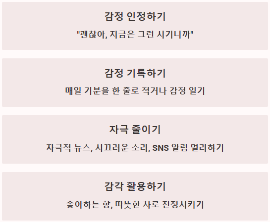 감정 기복을 겪을 땐 억누르거나 감추기보다, 나 자신에게 “괜찮아, 지금은 그런 시기니까”라고 말해주는 연습이 필요해요. 매일 아침 오늘의 기분을 한 줄로 적어보거나, 하루를 마치며 짧게 감정 일기를 써보는 것도 도움이 돼요. 좋아하는 향의 디퓨저를 틀어두거나, 따뜻한 차 한 잔을 천천히 마시며 5분간 아무것도 하지 않는 시간도 감정을 진정시키는 데 효과가 있어요. 특히 갱년기에는 뇌가 지나치게 예민해진 상태이기 때문에 자극적인 뉴스, 시끄러운 소리, 끊임없는 SNS 알림을 잠시 멀리해 보는 것도 감정 회복에 큰 도움이 돼요.