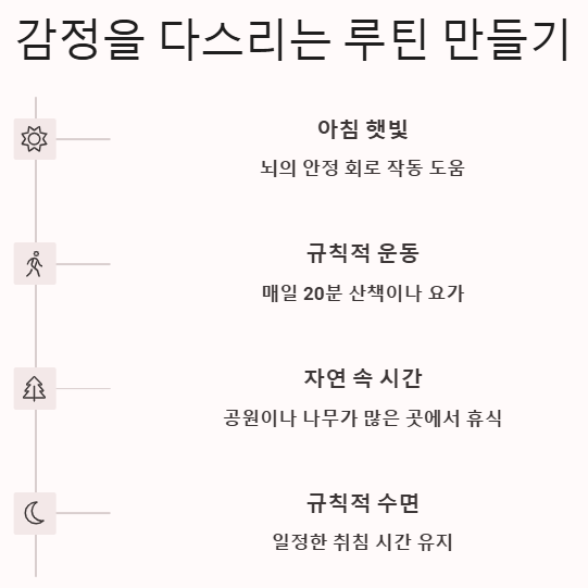 일상의 리듬을 다시 세우는 것도 큰 도움이 돼요. 규칙적인 수면 시간과 가벼운 운동, 아침 햇빛을 받는 루틴은 뇌의 안정 회로를 다시 작동시켜 줘요. 매일 정해진 시간에 20분 정도 산책하거나, 요가·스트레칭 같은 이완 운동을 꾸준히 해보는 것도 감정 안정에 효과적이에요. 더불어 자연이 주는 치유력을 활용해, 공원 산책이나 나무가 많은 곳을 찾아 조용히 앉아 있는 시간도 마음을 맑게 해 줘요.