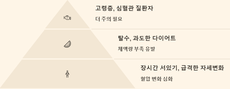 하루 동안 물 섭취량이 부족하거나 무더운 날씨에 과도한 땀을 흘린 경우에도 증상이 심해질 수 있으니, 평소 충분한 수분 섭취와 천천히 움직이는 습관을 들이는 것이 중요해요.