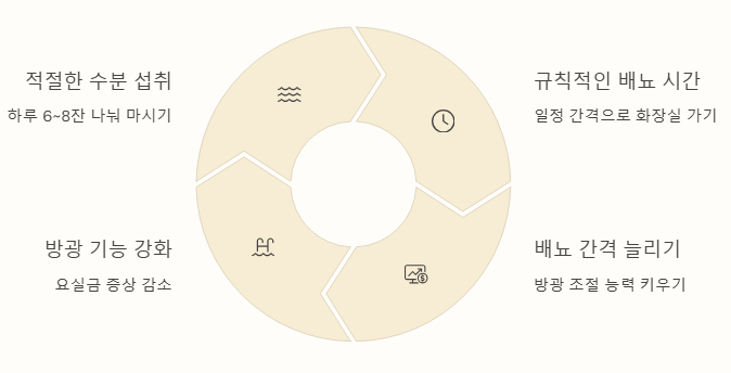 한 번에 많은 양의 수분을 섭취하기보다는 하루 6~8잔을 나눠서 섭취하고, 배뇨 간격을 서서히 늘려 방광 조절 능력을 키워야 합니다.